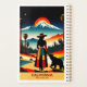 Celebrate the warmth and vibrancy of "California: Where Sunshine Lives" with this eye-catching travel planner! This captivating travel planner features a woman in a multicolored dress and hat standing beside a bear, both gazing at a stunning landscape that blends palm trees and a snow-capped mountain, all bathed in the warm glow of a dramatic sunset. With its retro, surreal style, the artwork beautifully encapsulates California’s diverse scenery and vibrant spirit, making it a perfect tribute to the Golden State’s enchanting allure.