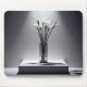 A sleek contemporary glass vase holds several calla lilies bathed in a soft spotlight that creates a dramatic effect.