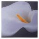 These decorative ceramic tiles feature an illustration of a calla lily with hints of pale purple and a centre of bright orange. Their is an effect of glitter throughout the image and a reflective golden glow on the petals near the stamen.