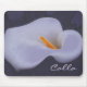 This mousepad features an illustrated calla lily (Zantedeschia aethiopica) in a muted grayish purple with an orange and yellow centre. There is a personalizable text area in the bottom right corner in simple cursive script.