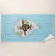 Callie the paisley hawksbill sea turtle swims through the shallow water of the lagoon she calls home, looking for her next snack. A pattern of faint seaweed on a pale blue base creates a lovely backdrop for the sweet sea turtle.