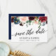 Modern Elegant Calligraphy, Watercolor Burgundy Marsala Blue Floral Wedding Save The Date Card - Blue Back
