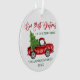 Modern Fun Calligraphy Script Our First Christmas in our New Home Ornament includes Watercolor Vintage Red Truck with Christmas Tree. Red and Green Text.