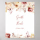 This calligraphy graceful floral guest book sign is perfect for a modern wedding or bridal shower. The design features dainty watercolor white, burgundy, pink roses and fall leaves.