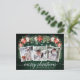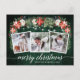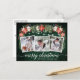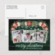 Modern Elegant Calligraphy Script, Watercolor Winter Floral, String Lights Couple 3 Photo Merry Christmas Postcard includes watercolor red poinsettias, white roses, holly berries, pine cones and botanical greenery foliage. Rustic Country Green Wood.
