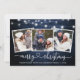 Modern Calligraphy Heart Script Merry Christmas 3 Photo Holiday Card - Rustic Country Blue Wood and String Lights