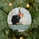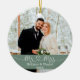 Modern Minimalist Simple Calligraphy Script Mr. and Mrs. Heart Bride and Groom Wedding Photo Ornament with Snowflakes back. Sage Green