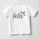 Hello calligraphy letters, three feathers in pink, blue, green colour, boho design