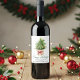 Modern Elegant Calligraphy Ink Script Happy Holidays Wine Label includes a Watercolor Pine Tree in a paper bag with a Red Ribbon Bow, Gold and Red Christmas Ornaments.