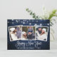 Modern Fun Calligraphy Script 3 Photo Family Happy New Year Card with String Lights - Rustic Blue Wood Print