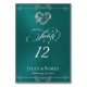 The design features an elegant teal background embellished with scroll borders, a heart and placeholders for the table number, couple's names and date of event. Available in several colours for your wedding theme. Designed to coordinate with the Romantic Scroll Hearts & Calligraphy Wedding Collection. To change details, click «Personalise». To move the text or change the text size, font, or colour click «Click to customise further».