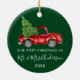 Modern Trendy Calligraphy Script Our First Christmas as Mr. and Mrs. Personalised Ornament includes Watercolor Vintage Red Truck with Christmas Tree - Forest Green
