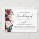 Modern Minimalist Simple yet Elegant Calligraphy Script Burgundy Floral Wedding Invitation Card. Watercolor floral includes burgundy roses, blue flowers, pink roses, red flower and botanical greenery. Navy Blue back.