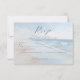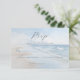 This RSVP card features a serene beach scene with gentle waves and sandy shores under a soft blue sky, creating a tranquil seaside atmosphere. The minimalist yet detailed design uses calming blues, whites, and warm beige tones to evoke peace and elegance. Elegant script typography highlights the "RSVP" at the top, while clean sans-serif fonts provide clear instructions and customisable response options for guests. Perfect for formal events near coastal locations, this card captures the essence of relaxation and anticipation.