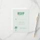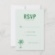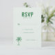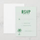 This wedding RSVP card features a minimalist and elegant design with a light mint green background, creating a calming and inviting atmosphere. The layout is clean and balanced, with bold uppercase "RSVP" text at the top and customisable fields for personalisation. A simple palm tree illustration adds a touch of tropical charm, while the sans-serif typography ensures readability and a modern feel. Perfect for couples seeking a sophisticated yet approachable look for their event invitations.