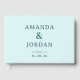 This wedding guest book features a minimalist design with a soft, pastel mint green background that creates a calming and elegant atmosphere. The layout is clean and balanced, showcasing bold, uppercase typography for the names "Amanda & Jordan," followed by customizable location and date details in smaller text. The modern sans-serif font adds a contemporary touch, while the generous spacing between lines enhances readability and visual appeal. Perfect for formal occasions, this design exudes sophistication and simplicity, making it an ideal choice for couples seeking a refined yet understated aesthetic.