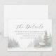 This wedding enclosure card features a serene winter landscape with a cozy wooden cabin nestled among snow-covered trees, creating a tranquil and inviting atmosphere. The design employs soft watercolor techniques with a muted palette of whites, grays, and warm browns, enhancing the dreamlike quality of the scene. Elegant script typography at the top reads "The Details," while clean sans-serif text provides information about accommodations, directing guests to a customizable website for more details. The overall mood is calm and nostalgic, perfect for setting the tone for a peaceful winter celebration.