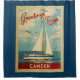 This Greetings From Camden Maine vintage travel nautical design features a boat sailing on the water with seagulls and a blue sky filled with gorgeous puffy white clouds.