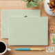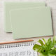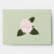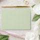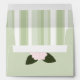 The inside of this sage green wedding rsvp envelope is filled with tone on tone stripes in varying shades of sage green. A big, soft pink, watercolor Camellia blossom with dark green leaves is placed partly on the back flap and partly on the bottom portion of the back giving the appearance of a seal. From my original digitally created image.