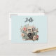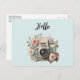 A postcard with a vintage styled camera decorated with flowers. Pastel colors of pink, cream and green.