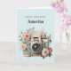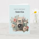 Birthday card with a vintage styled camera decorated with flowers. Pastel colors of pink, cream and green.