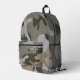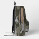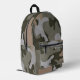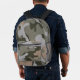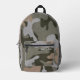 Backpack with camouflage pattern design. Colours are army green, dark forest green, light grey, and tan. Include a name, in grey, distressed font, on the zipper pocket, or delete the sample text.