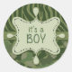 Camouflage round sticker with It's a Boy. Great for baby showers for boys. Use them for invitation envelopes, to dress up gifts, and also as baby shower favours.