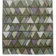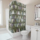 This shower curtain has a mid-century modern design of overlapping triangles running horizontally in camo colors.