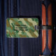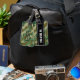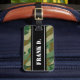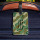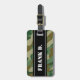 Personalised Camouflage pattern design travel luggage tag. Hunter green design with white monogrammed name intitial letters. Cool gift idea for soldier or hunter. Camo colour accessory for bags and suitcases.