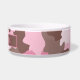 This pink camouflage dog bowl in shades of pink, dusty rose and brown will have your dog eating in style. Personalise with her name in a pink stencil typography on brown. Perfect for dog owners who love camo print. Designed by artist ©Susan Coffey.