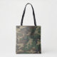 This camouflage tote bag features a woodland camouflage pattern across the entire bag. The colours in the woodland camo pattern include black, brown, tan, and dark forest green.
