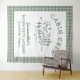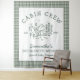 Custom Camp Bachelorette Party green Backdrop mountain girl trip, personalized retro luxury bachelorette party tapestry in forest green with clamping and a forest with mountains is perfect as a bachelorette party photo backdrop.
