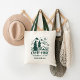 Create a unique custom tote for your next family camping trip or outdoor excursion. Tote bag features the quote "camp more, worry less" in distressed hunter green lettering beneath a hand drawn illustration of a camping tent set in a pine forest with a crescent moon rising over snow-capped mountain peaks. The perfect way to commemorate a special trip, or for anyone who loves camping, you can customise this tote with your choice of text beneath the design. Add your camping destination, the year, or a family name for a special touch. We love it with hunter green handles to match!