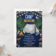 Hike on over to an epic birthday adventure! This stunning camp-themed birthday invitation features a magical navy night sky with a crescent moon, glowing string lights, towering pine trees, a classic grey tent, crackling bonfire with roasting marshmallows, lantern, hiking boots, sleeping bag, bear paw prints, and a camping sign — the perfect scene for a memorable outdoor celebration.