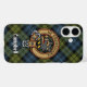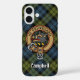 Campbell crest badge surrounded by a strap and buckle over tartan background. Custom text.
