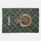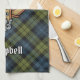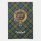 Campbell crest badge surrounded by a strap and buckle over tartan background. Custom text.