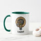Campbell crest badge surrounded by a strap and buckle over tartan background. Custom text on both sides.
