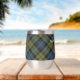 Campbell crest badge surrounded by a strap and buckle over tartan background. Custom text on both sides.