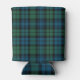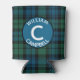 Stylish plaid can cooler done in the classic Scottish blue, green and black clan Campbell tartan plaid pattern.  A blue and black circle, on the front, has a white single letter monogram and curved white text fields ready to personalise.
