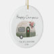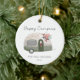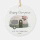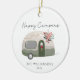Camper Retro Green Christmas - ornament features an adorable retro camper, all decked out for the holidays with string lights, winter florals, berries and string lights. Happy Campers is in pretty, modern script typography and is personalised with your family name and year.
