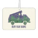 Add your names, your van's name or the name of your favourite park to create a custom souvenir. This custom car air freshener features an illustration of a camper fan with a popup tent on the roof and is illustrated to look like a moonlit night in the forest with a full moon in a star-filled indigo sky shining down on a grove of evergreen trees. Your own custom text appears below in blue lettering. The graphic and text appear on both sides of the air freshener.
