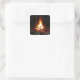 Photograph of a campfire made of sticks and surrounded by rocks, burning against a dark night sky.