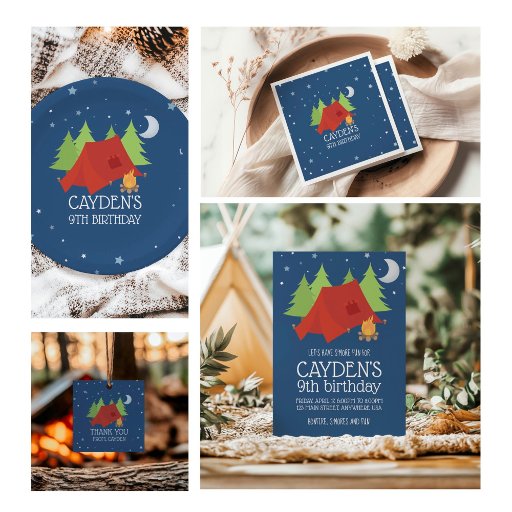 Camping birthday party favour stickers with tent, trees and starry night background.