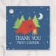 Camping birthday party favour tags with red tent, trees and starry night background.