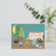 Camping Fun Postcard Features a brown and blue gradient background, pine trees, moon, RV Camper, grill and charcoal, campfire, beach chair, cooler, campground sign. Yellow and orange text is Campfire Fun. Background colour is customisable. Matching products include; Invitations, postage stamps, address labels, envelope seals, greeting cards, postcards, party favour stickers, cake toppers, yard sign are also available in our shop.