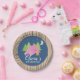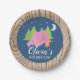 Camping birthday party plates with pink tent, trees and wooden background.