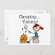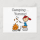 A stick figure boy toasts hot dogs over a campfire and text reads "Camping is Yummy" on camping design T-shirts, mugs, cards, stickers, tote bags, and other items, perfect for anyone whose favourite part of camping is hot dogs cooked on an open campfire!