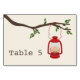 A wedding table number place card featuring an illustration of an oil lantern hanging from a tree branch with green leaves.