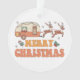 Camping Merry Christmas Reindeer Typography Ornament features the text "Merry Christmas" in a retro script typography with a festive decorated caravan being pulled by reindeer and accented with snowflakes and holly. Designed by Evco Studio www.zazzle.com/store/evcostudio