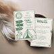 A modern, elegant and chic 30th birthday party weekend itinerary invitation template with a camping theme, featuring minimalist line drawings of a tent with mountains, trees and sign posts for the title, "Let's Go Camping", and other cute, hand-drawn symbols for a map and other camping things (roasted marshmallow etc.). A trendy and fun choice for a woman turning thirty for a glam weekend of fun camping, hiking or anywhere outdoors, in a soothing, soft, outdoors forest green and a minimalist modern style.